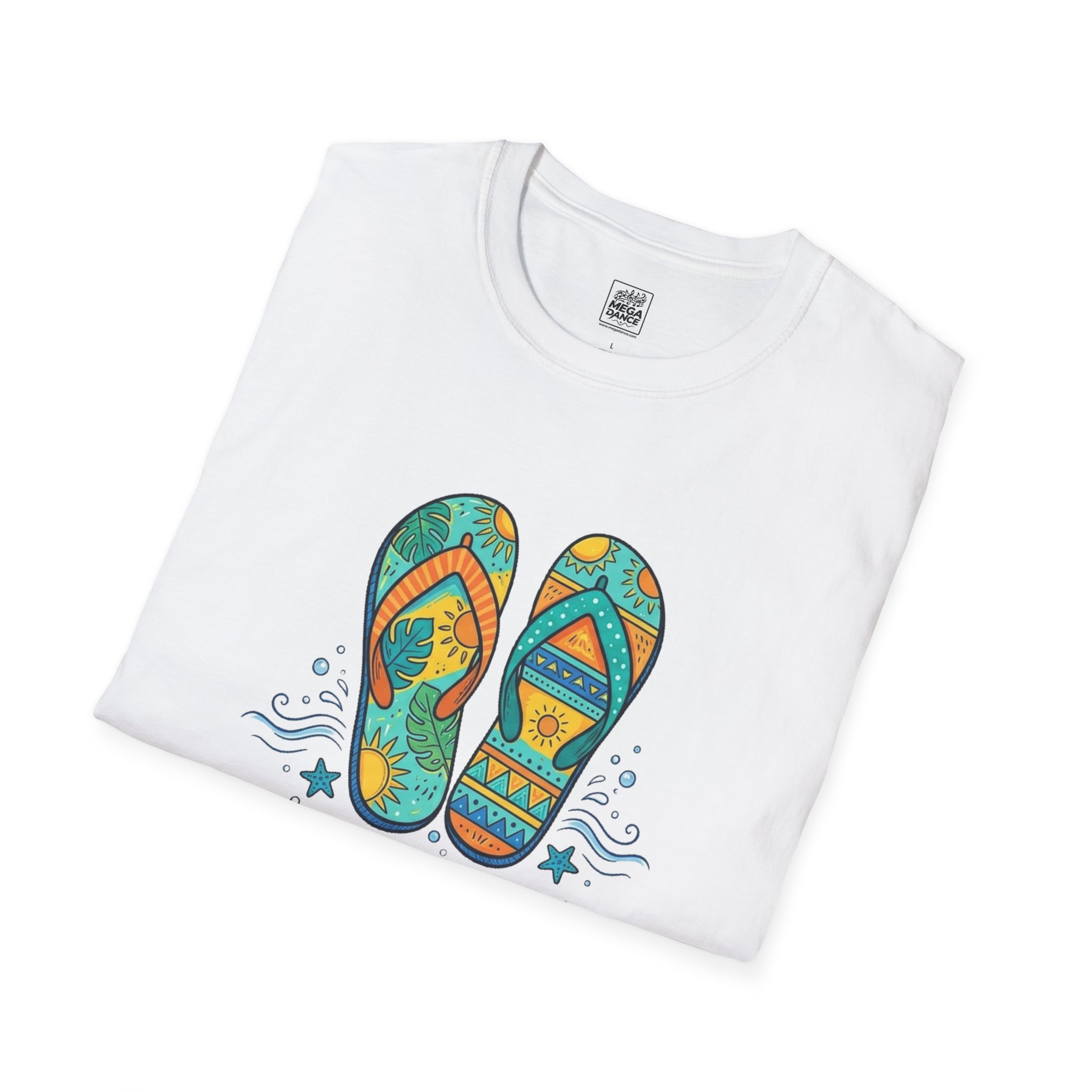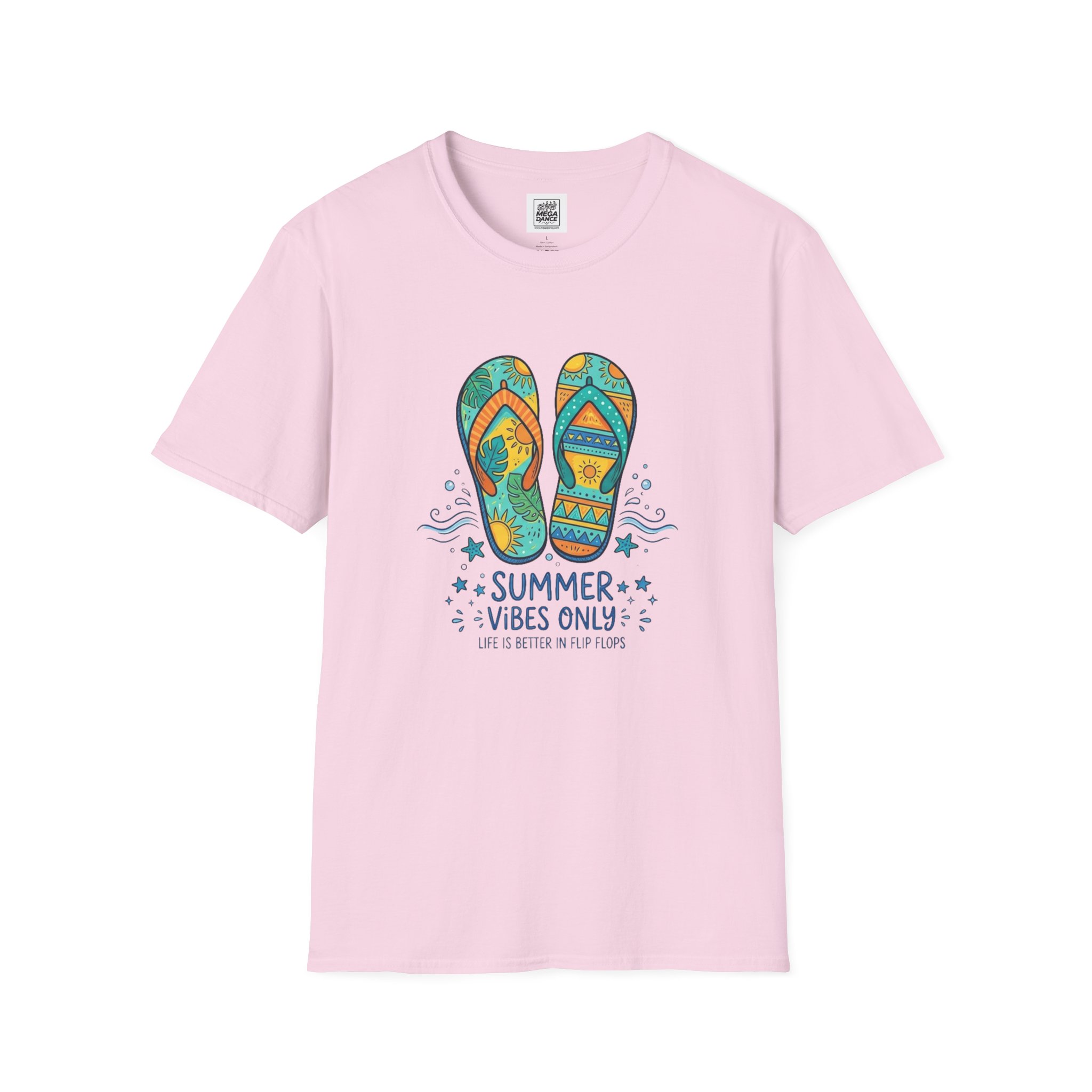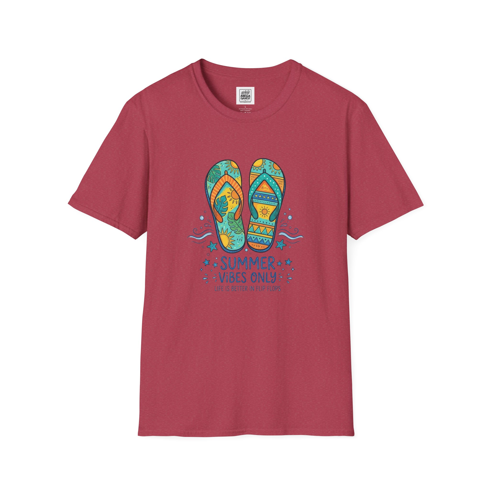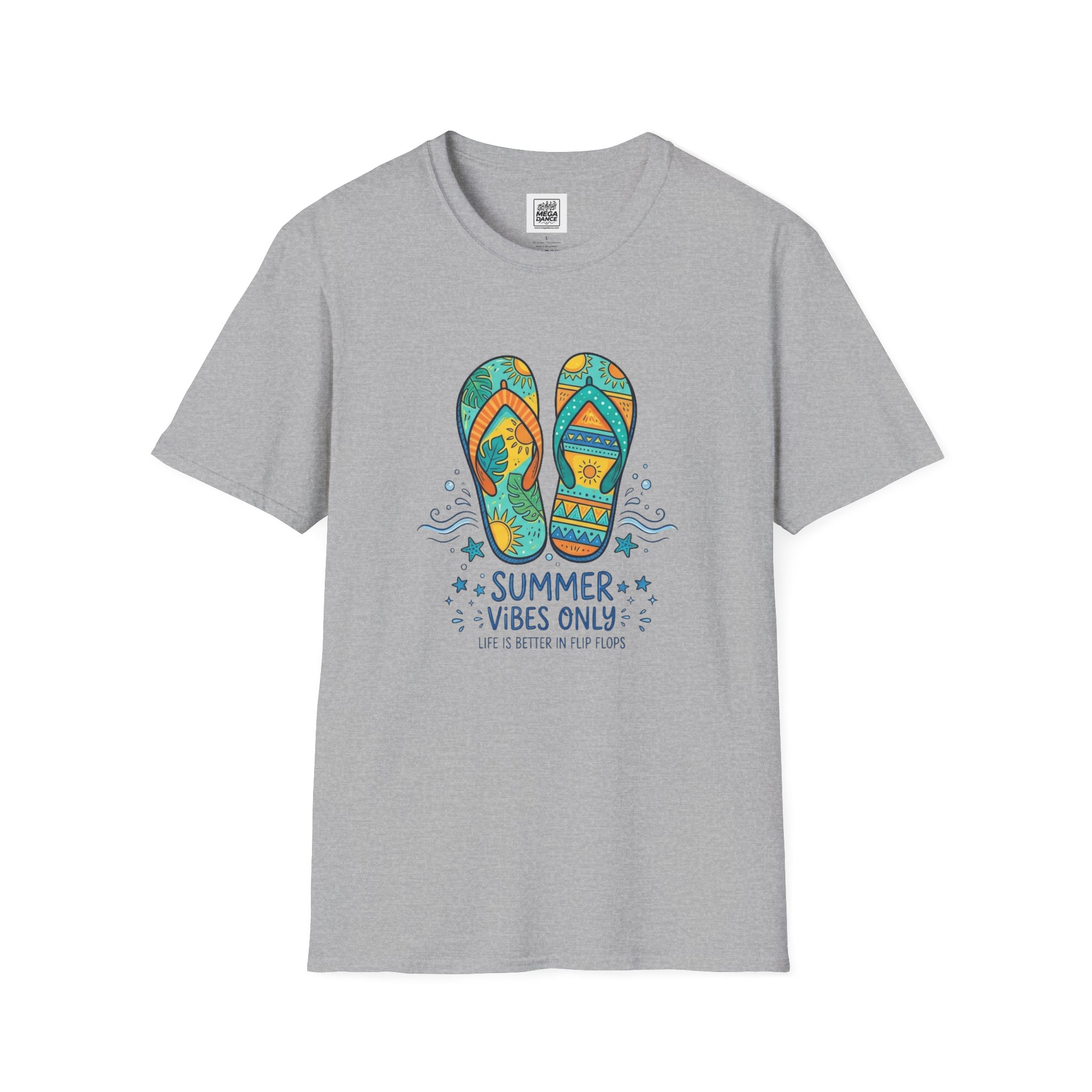 Feel the sand between your toes and the sun on your shoulders with this lightweight tee. A colorful pair of patterned flip-flops sits front and center with playful waves and the words “SUMMER VIBES ONLY,” evoking lazy beach days, boardwalk strolls, and late-afternoon bonfires. The soft, breathable cotton drapes casually—easy to layer over swimwear or wear on its own for warm-weather outings. Subtle natural flecks appear on unprocessed shades for an effortless, lived-in look. Wear it to signal slow afternoons, road trips to the coast, or evenings watching the horizon turn gold.