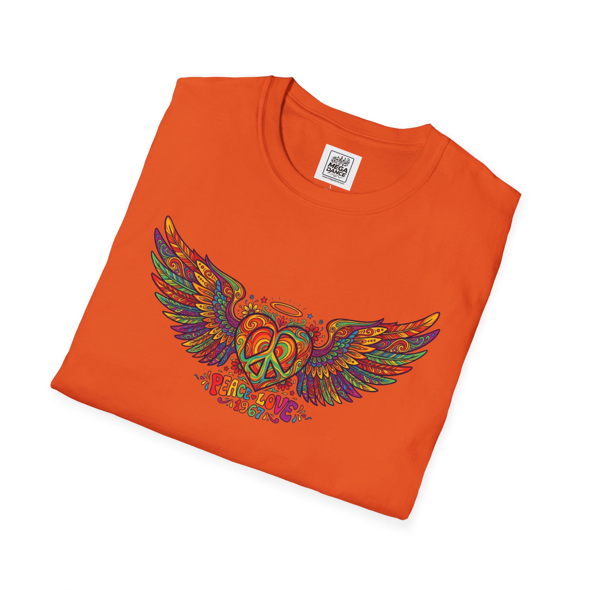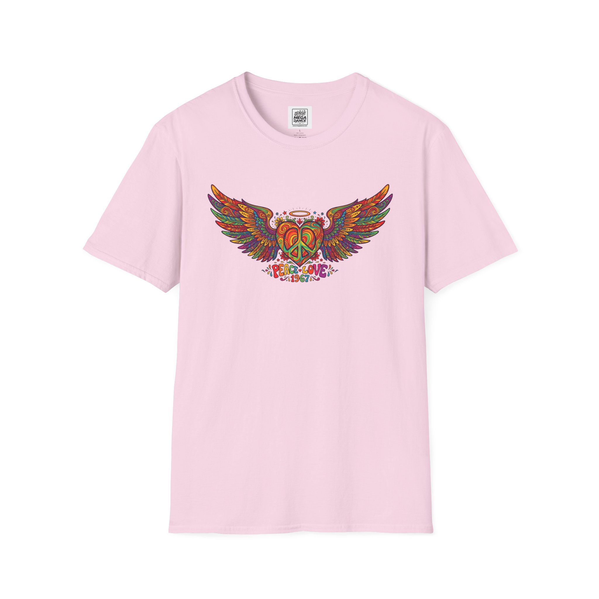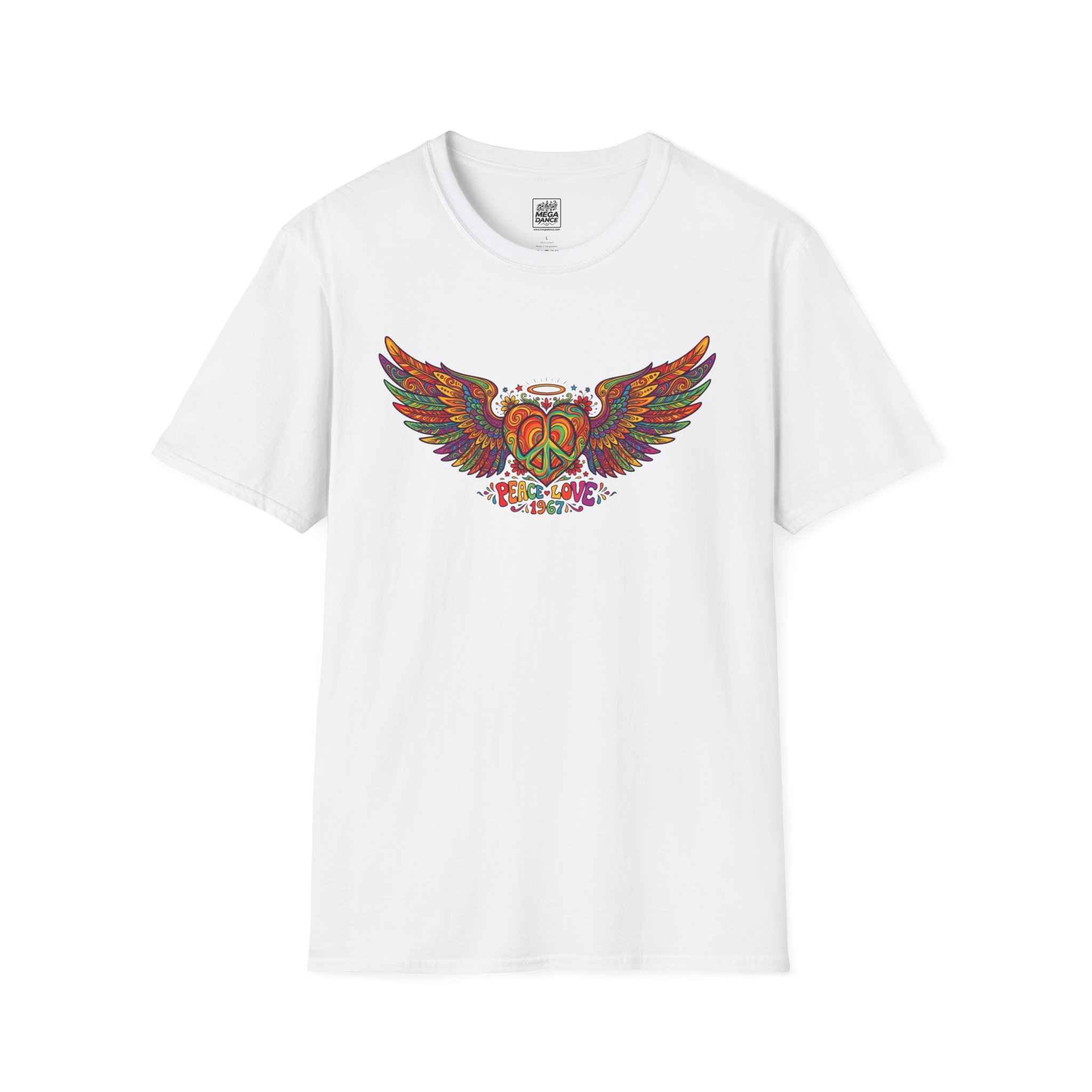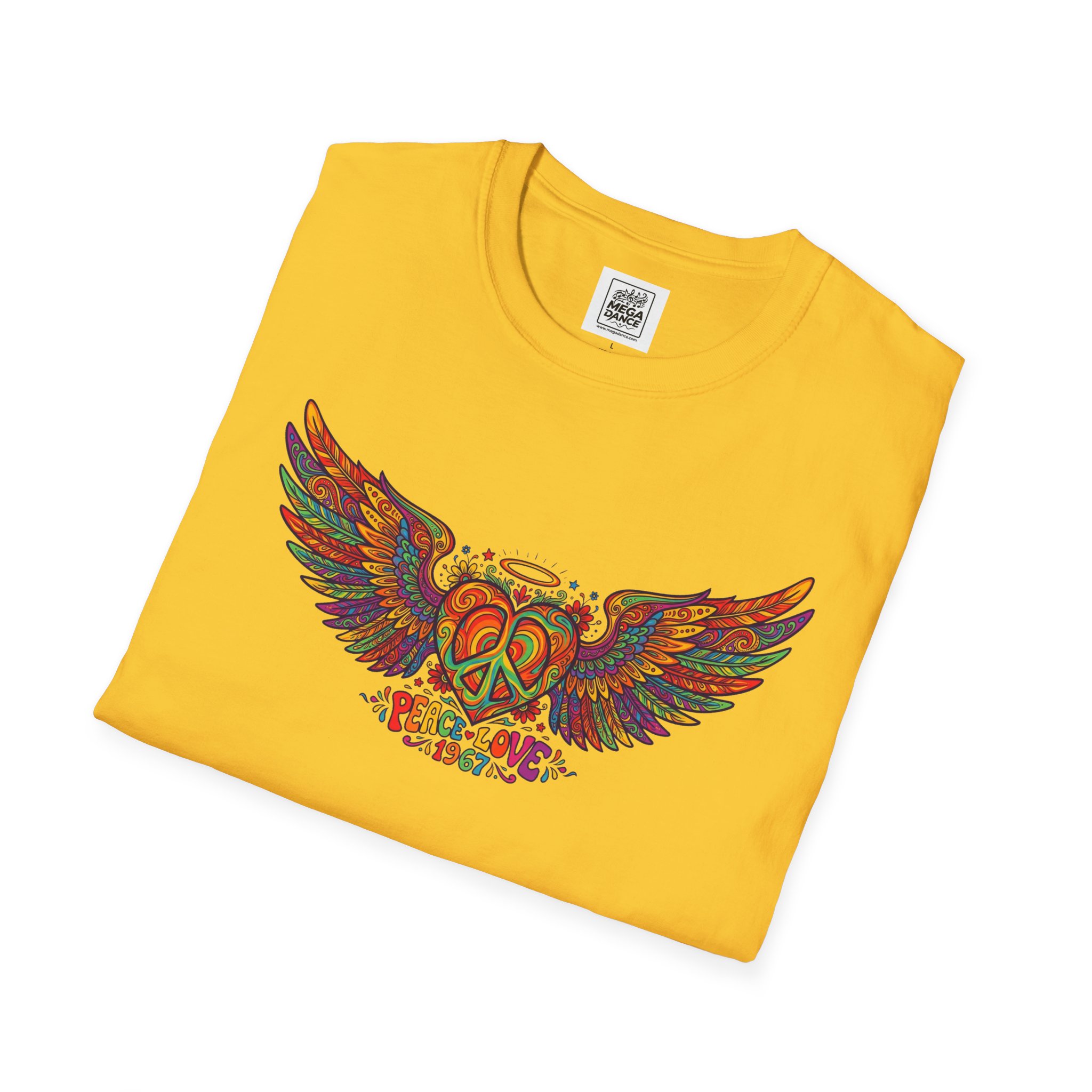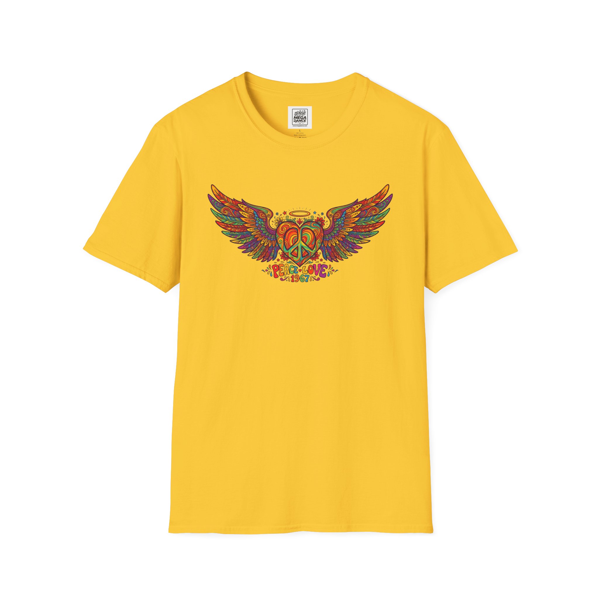 A soft, lived-in tee that carries a sunlit, freewheeling energy. Bright, hand-drawn wings spread across the chest around a peace-symbol crest, rendered in warm, psychedelic tones that feel like a summer road trip and a late-night bonfire at once. The lightweight ring-spun cotton drapes easily, so the artwork sits naturally on the body without stiffness. Wear it to concerts, park mornings, or when you want a subtle nod to vintage festival style — it moves with you and keeps the design front and center.