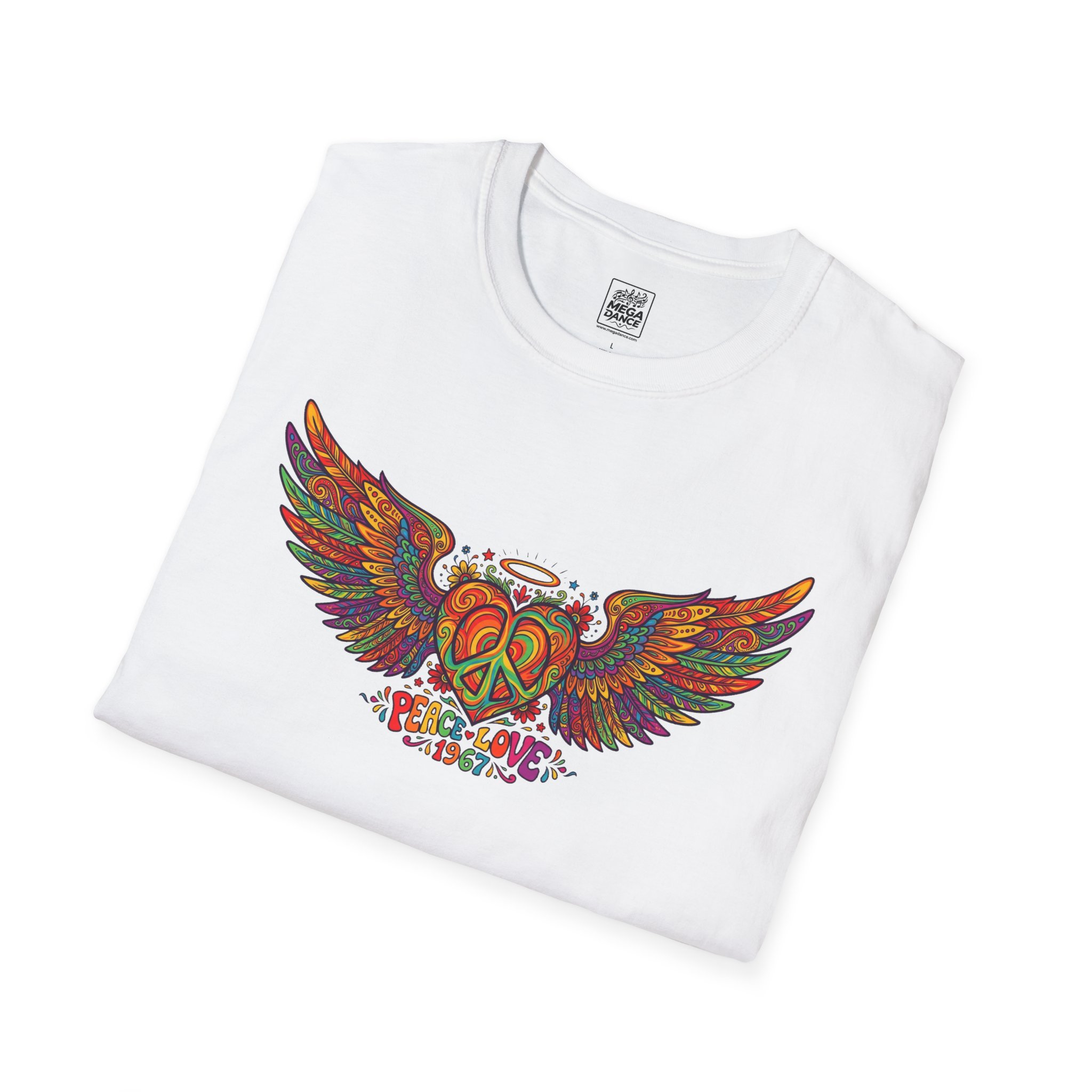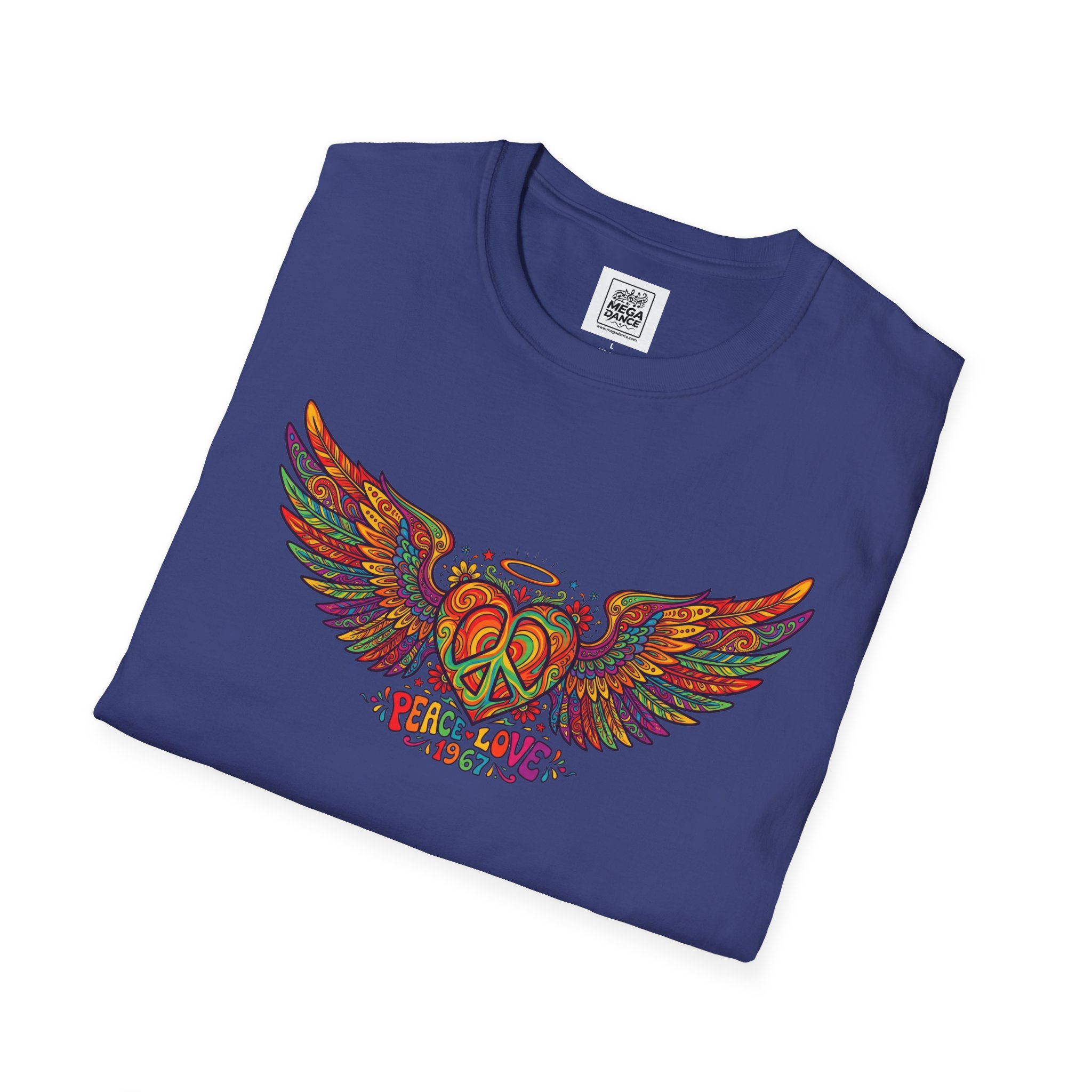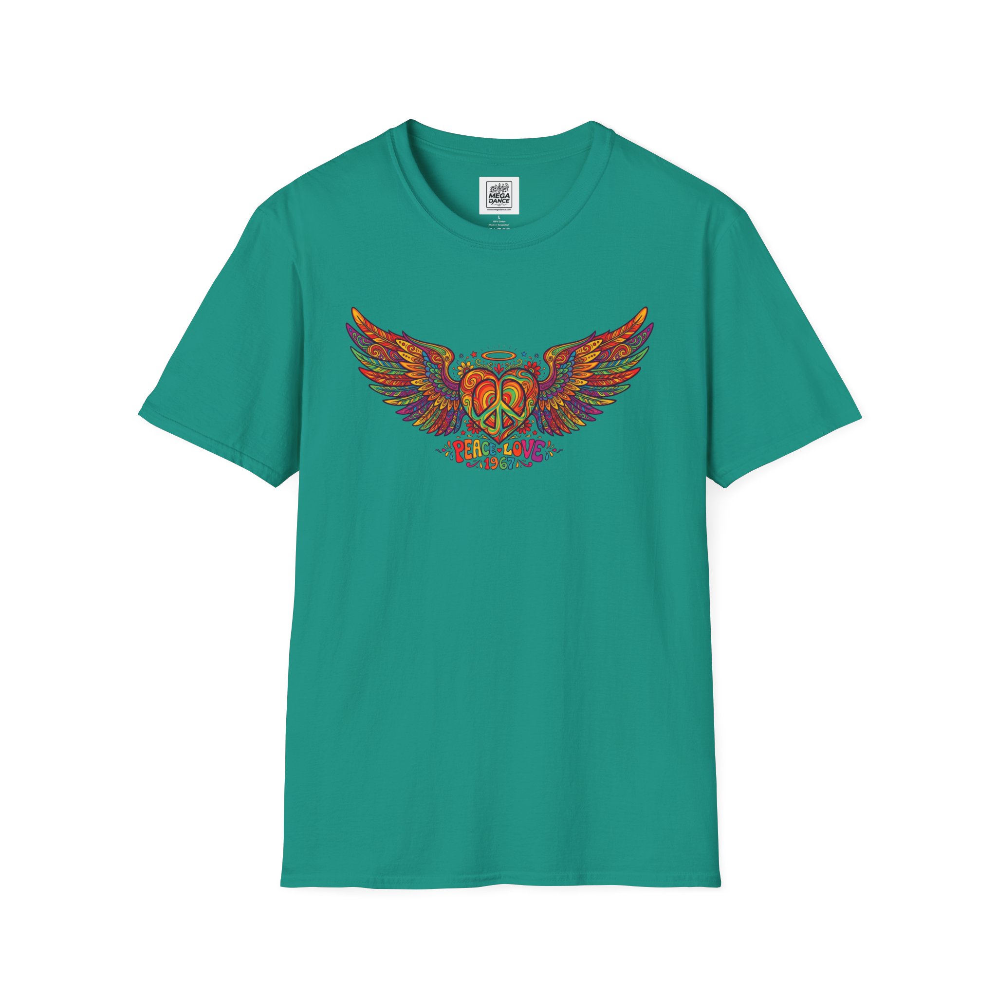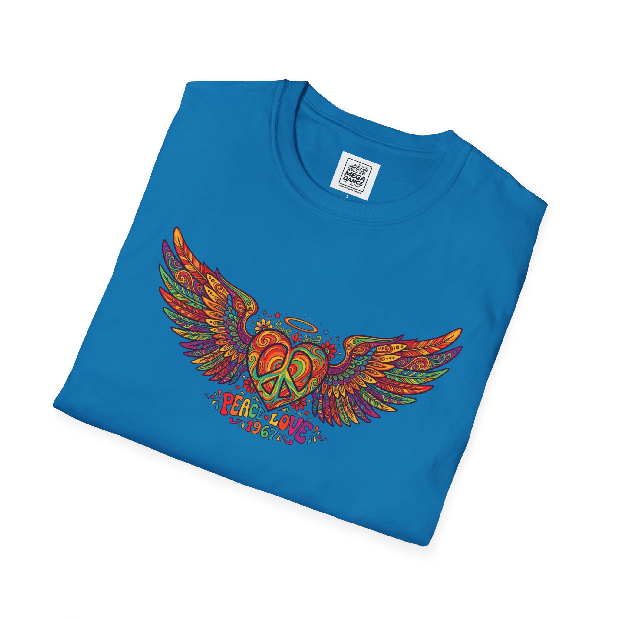 A soft, lived-in tee that carries a sunlit, freewheeling energy. Bright, hand-drawn wings spread across the chest around a peace-symbol crest, rendered in warm, psychedelic tones that feel like a summer road trip and a late-night bonfire at once. The lightweight ring-spun cotton drapes easily, so the artwork sits naturally on the body without stiffness. Wear it to concerts, park mornings, or when you want a subtle nod to vintage festival style — it moves with you and keeps the design front and center.