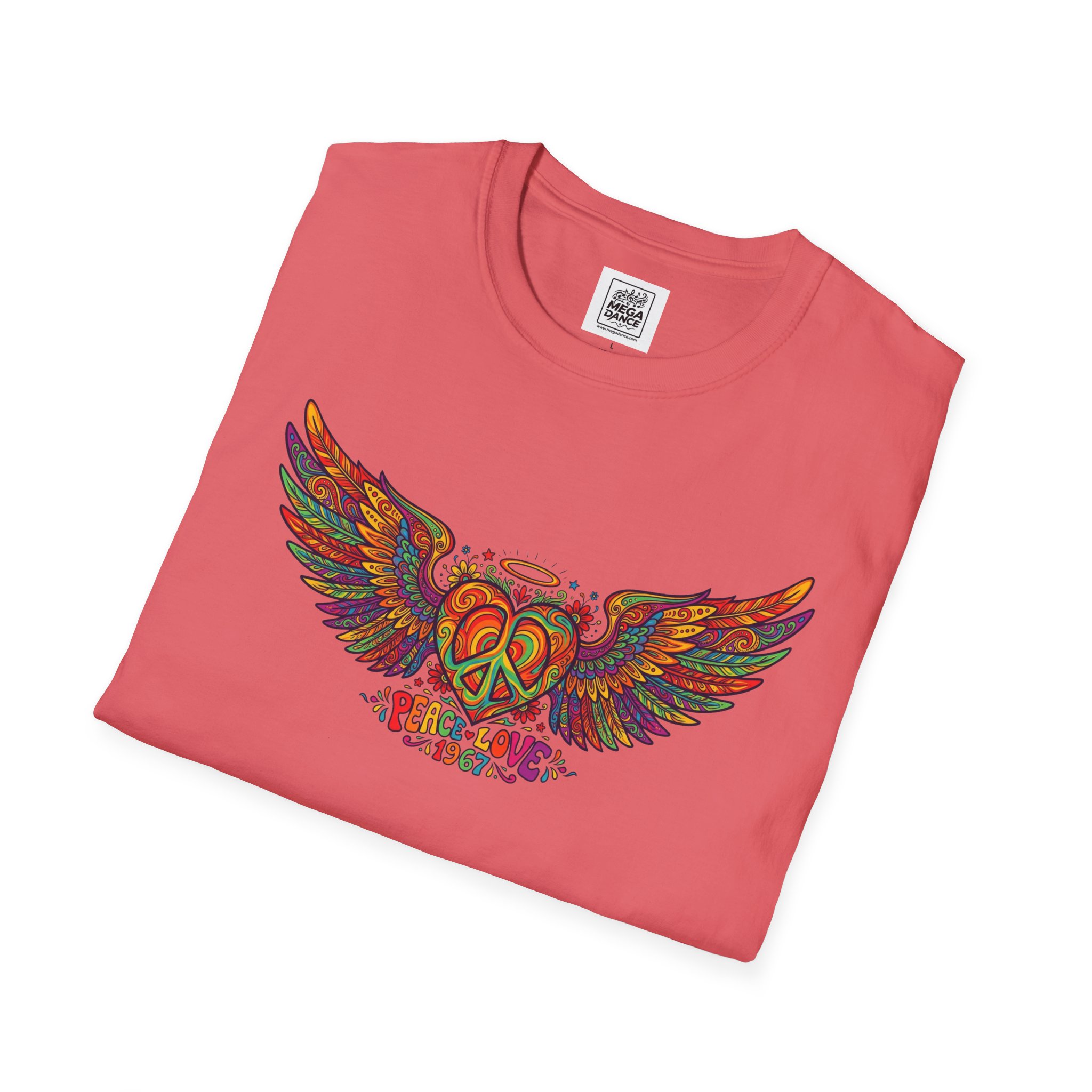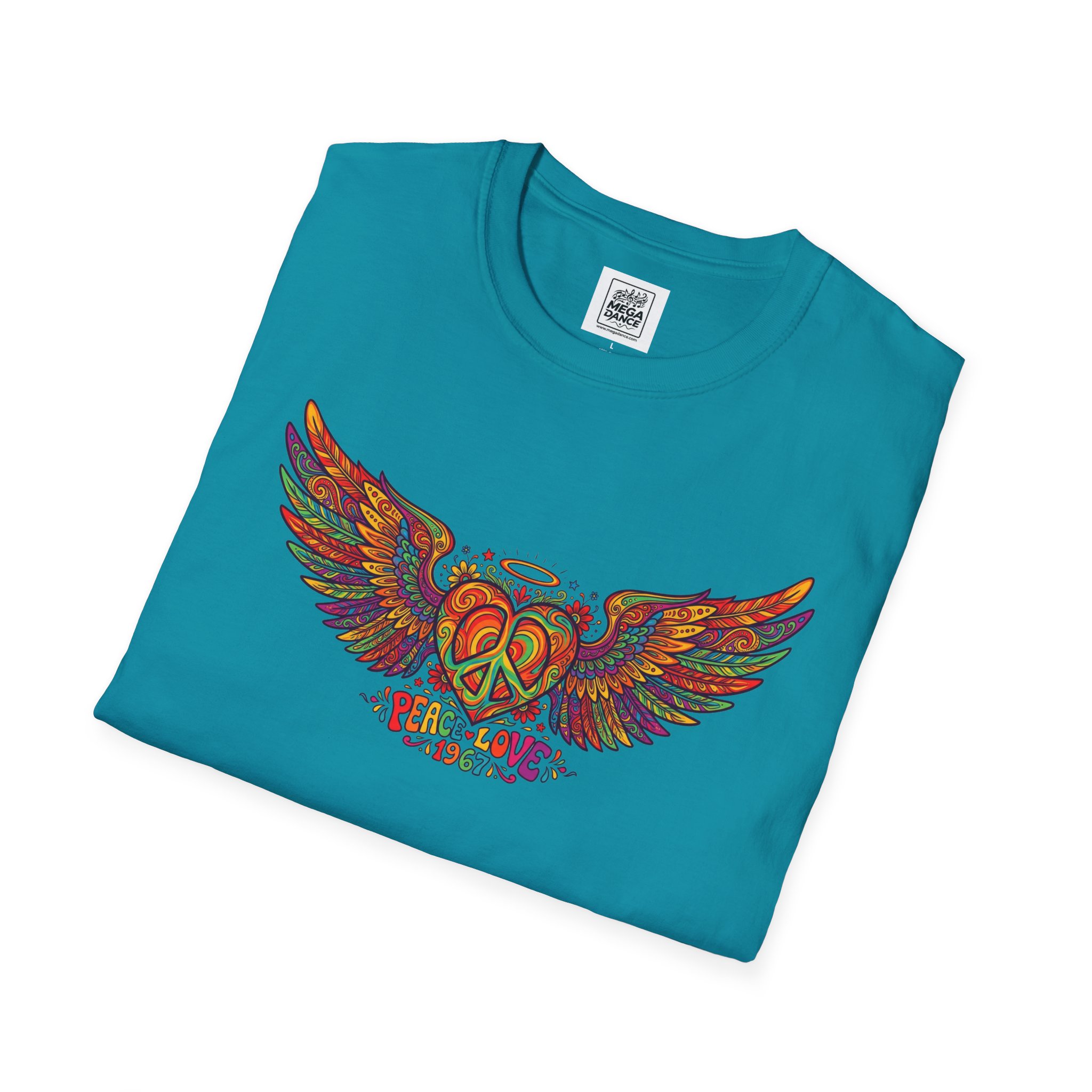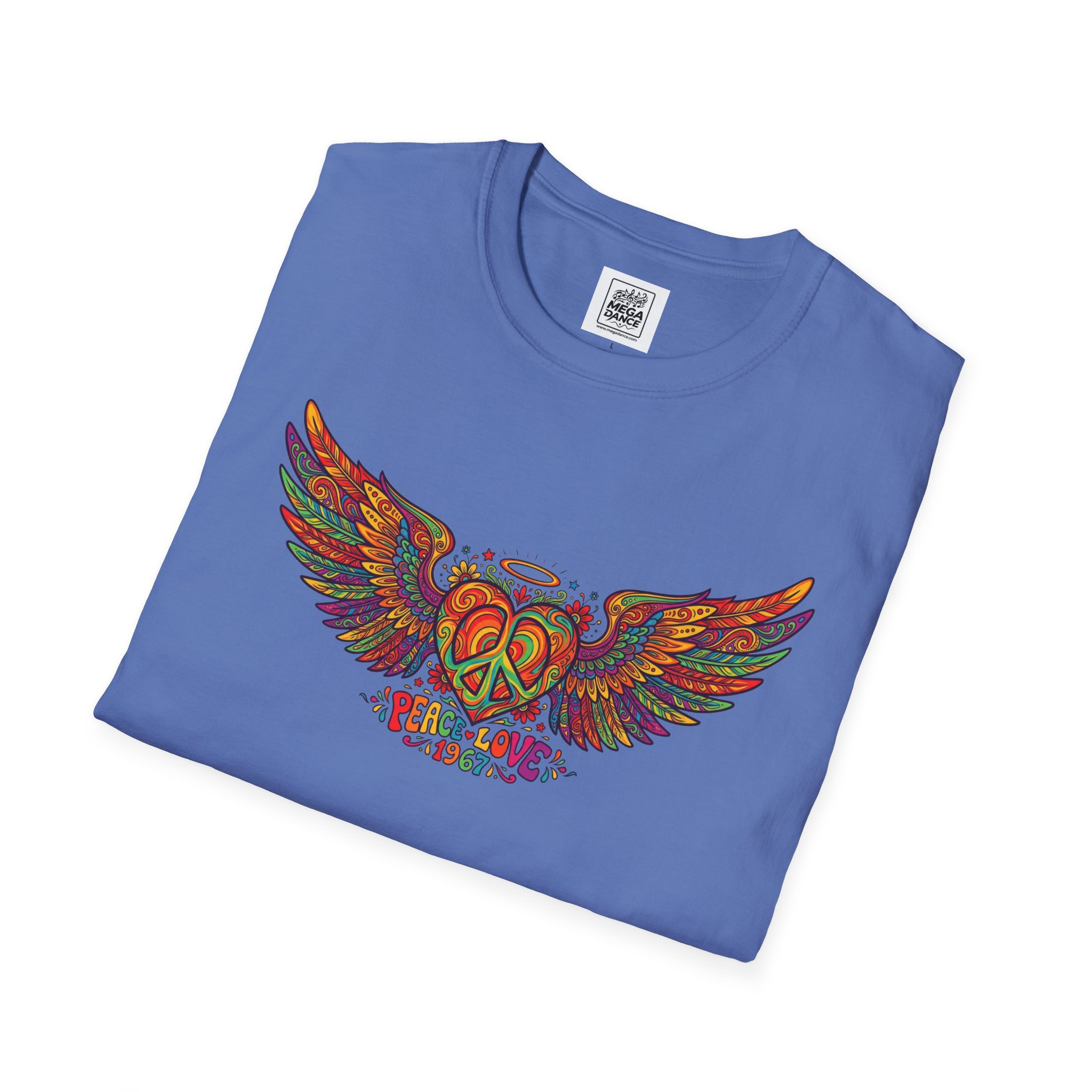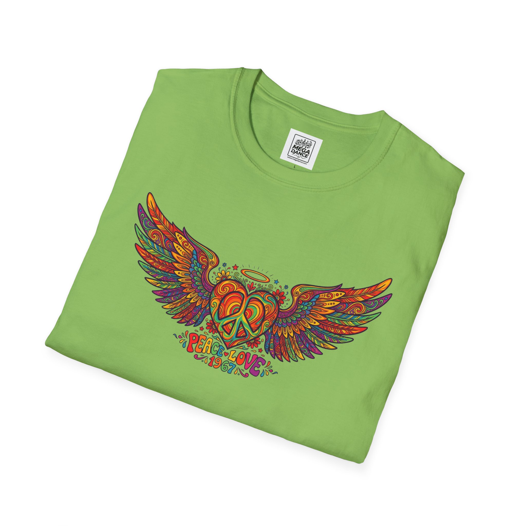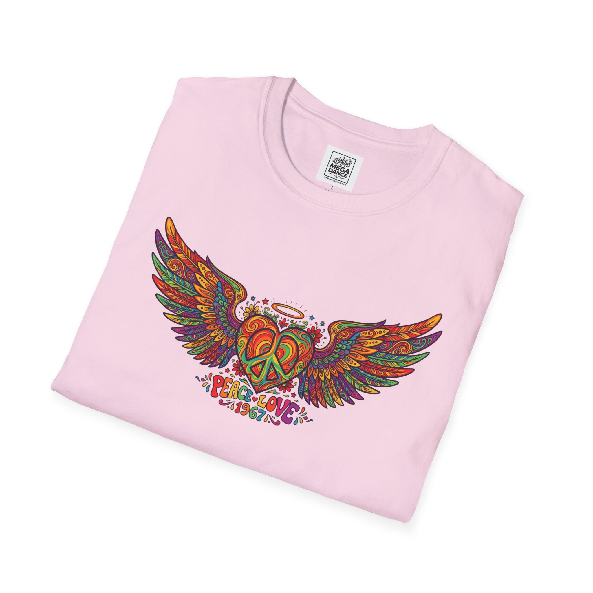 A soft, lived-in tee that carries a sunlit, freewheeling energy. Bright, hand-drawn wings spread across the chest around a peace-symbol crest, rendered in warm, psychedelic tones that feel like a summer road trip and a late-night bonfire at once. The lightweight ring-spun cotton drapes easily, so the artwork sits naturally on the body without stiffness. Wear it to concerts, park mornings, or when you want a subtle nod to vintage festival style — it moves with you and keeps the design front and center.