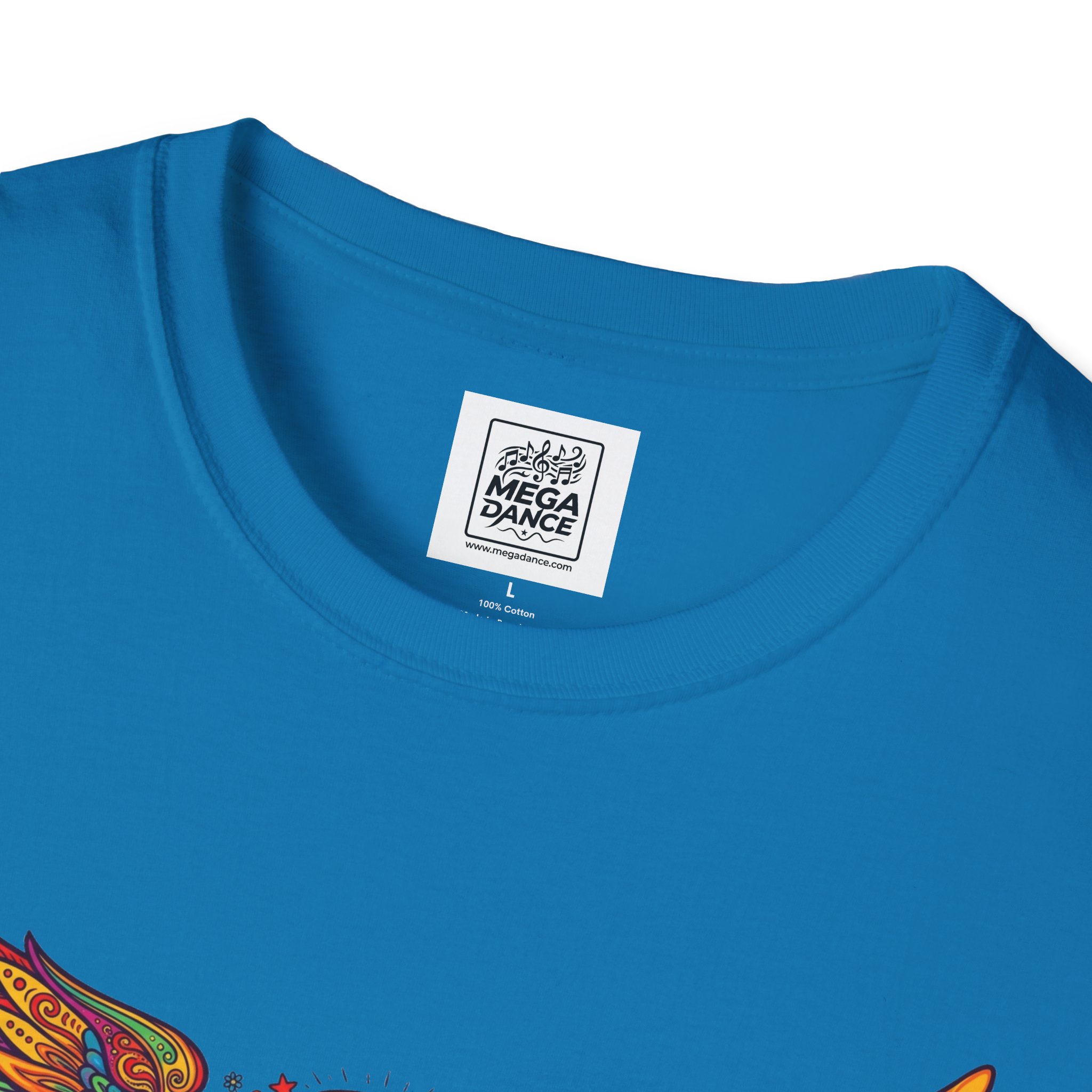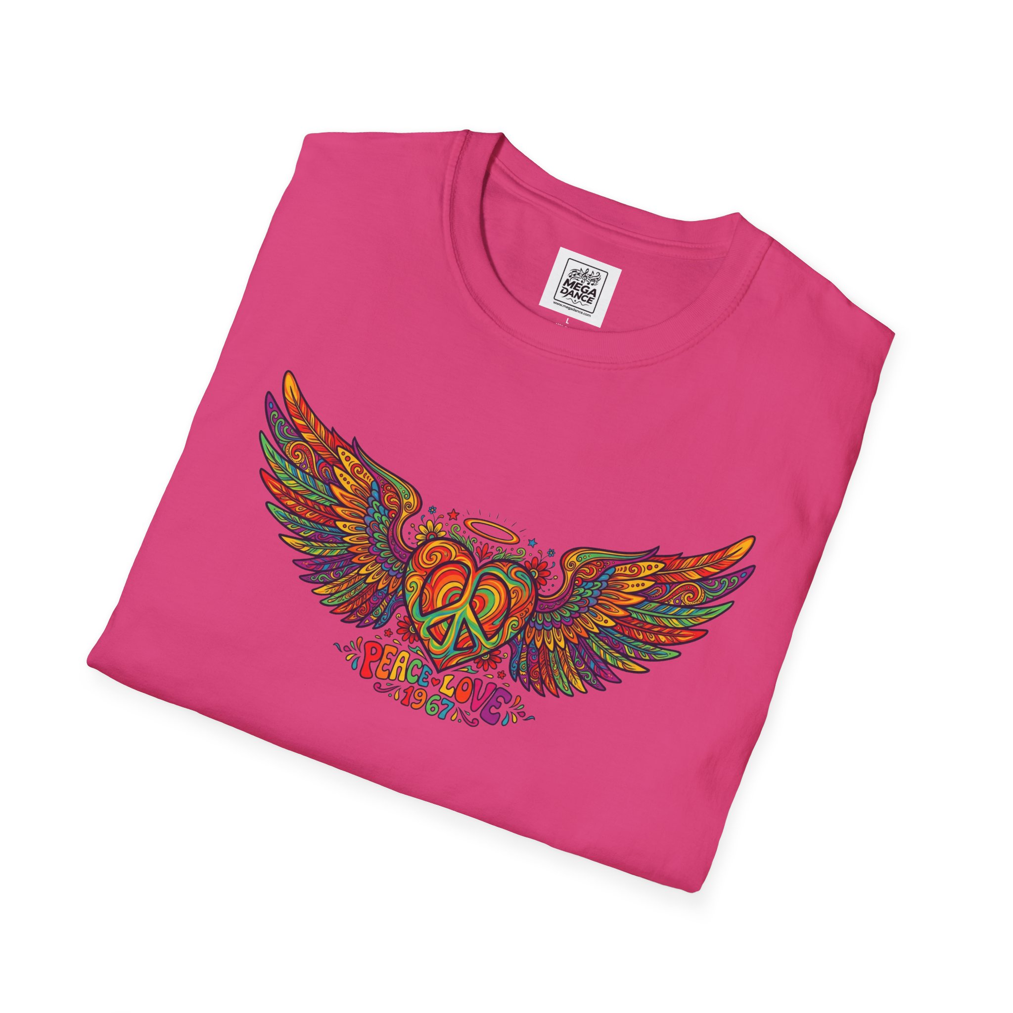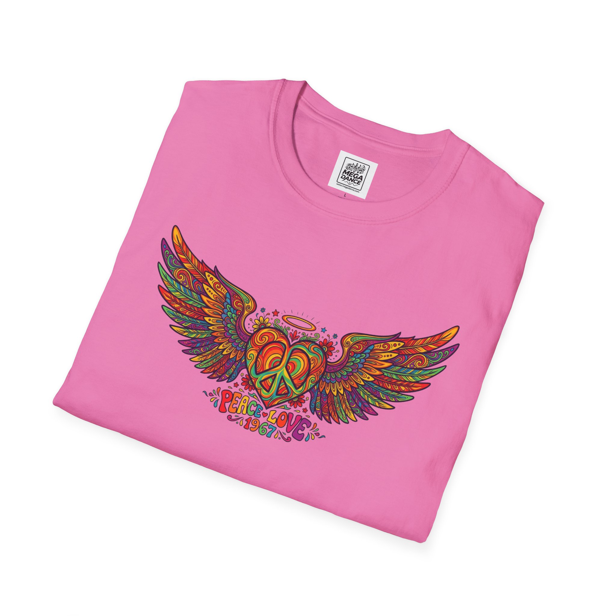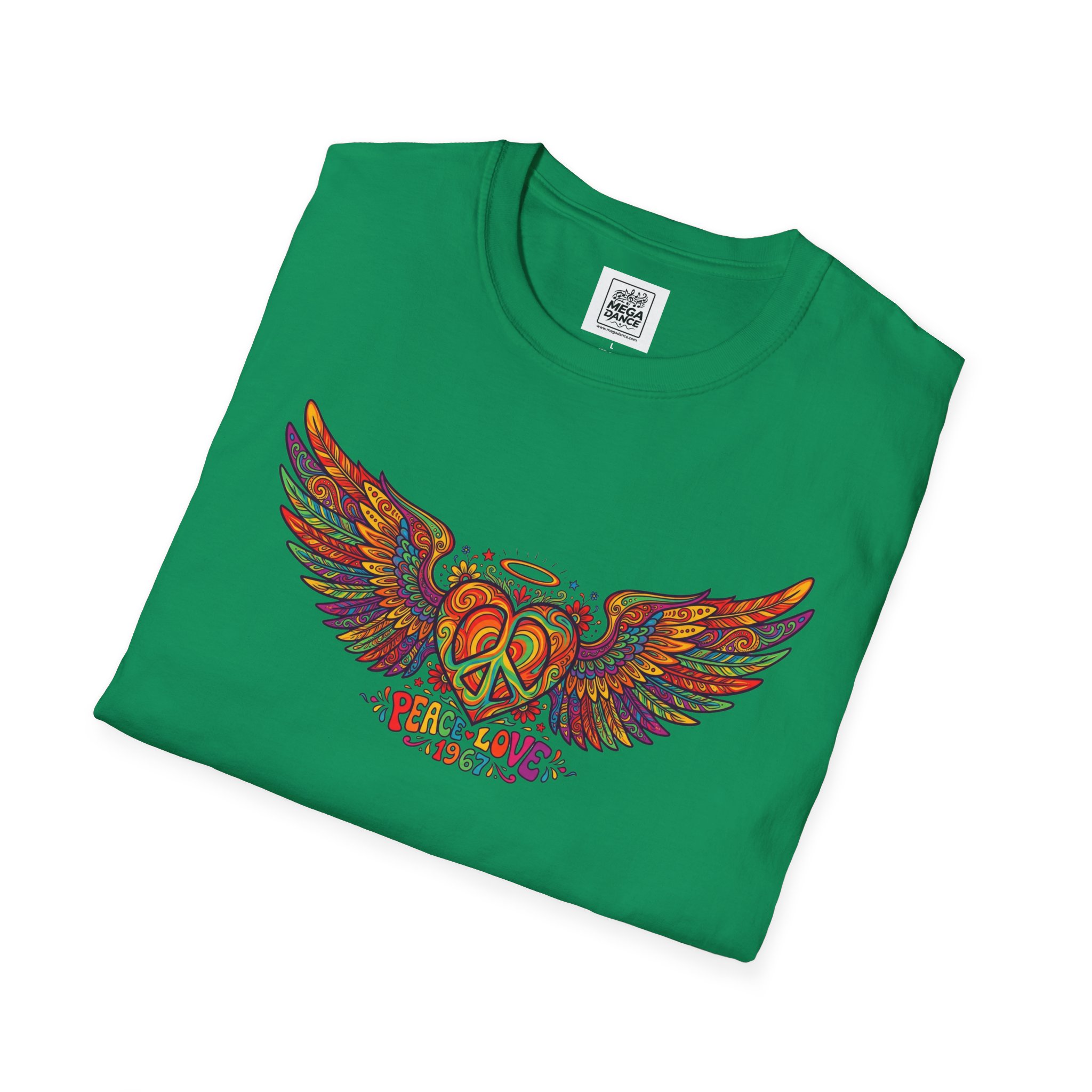 A soft, lived-in tee that carries a sunlit, freewheeling energy. Bright, hand-drawn wings spread across the chest around a peace-symbol crest, rendered in warm, psychedelic tones that feel like a summer road trip and a late-night bonfire at once. The lightweight ring-spun cotton drapes easily, so the artwork sits naturally on the body without stiffness. Wear it to concerts, park mornings, or when you want a subtle nod to vintage festival style — it moves with you and keeps the design front and center.