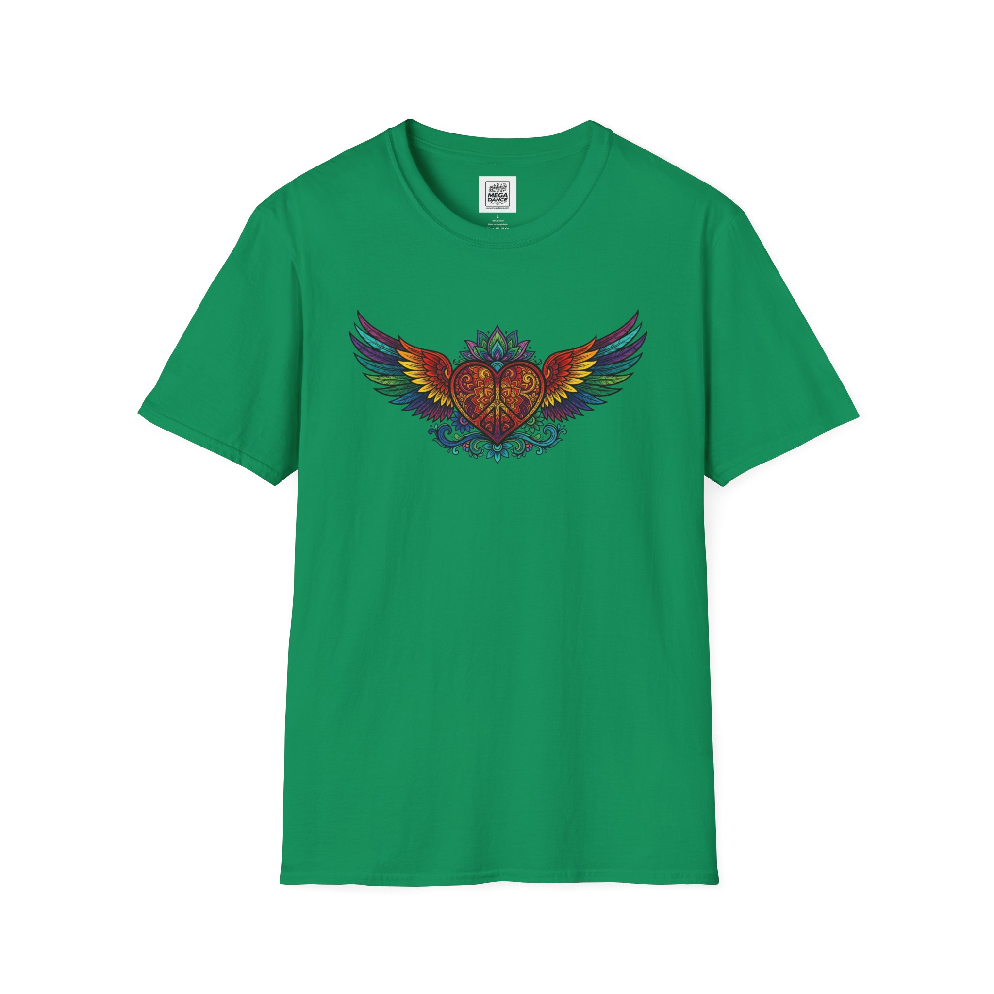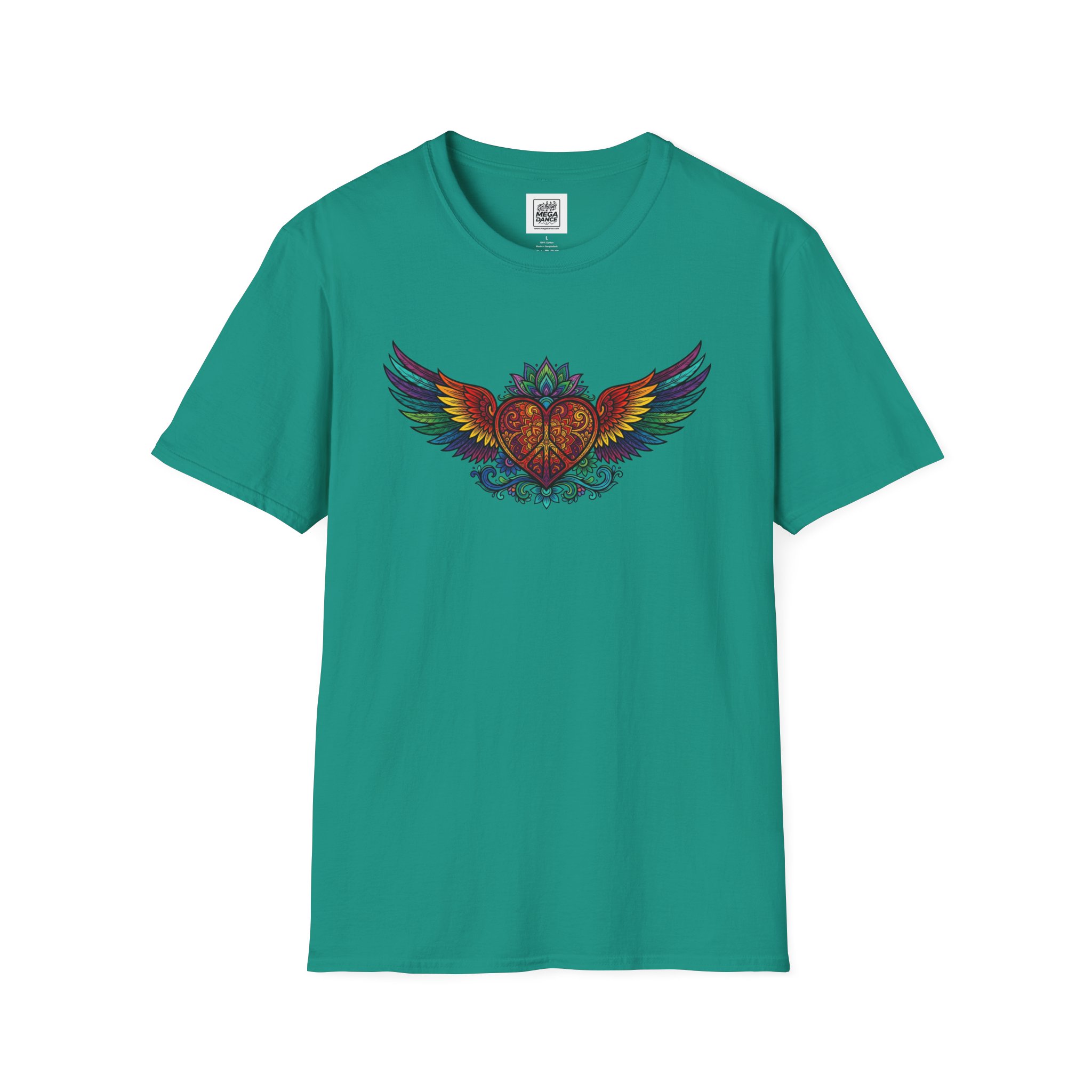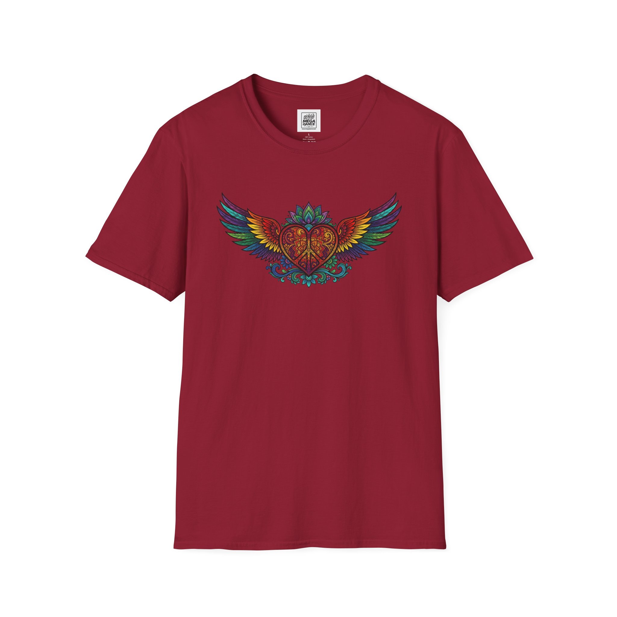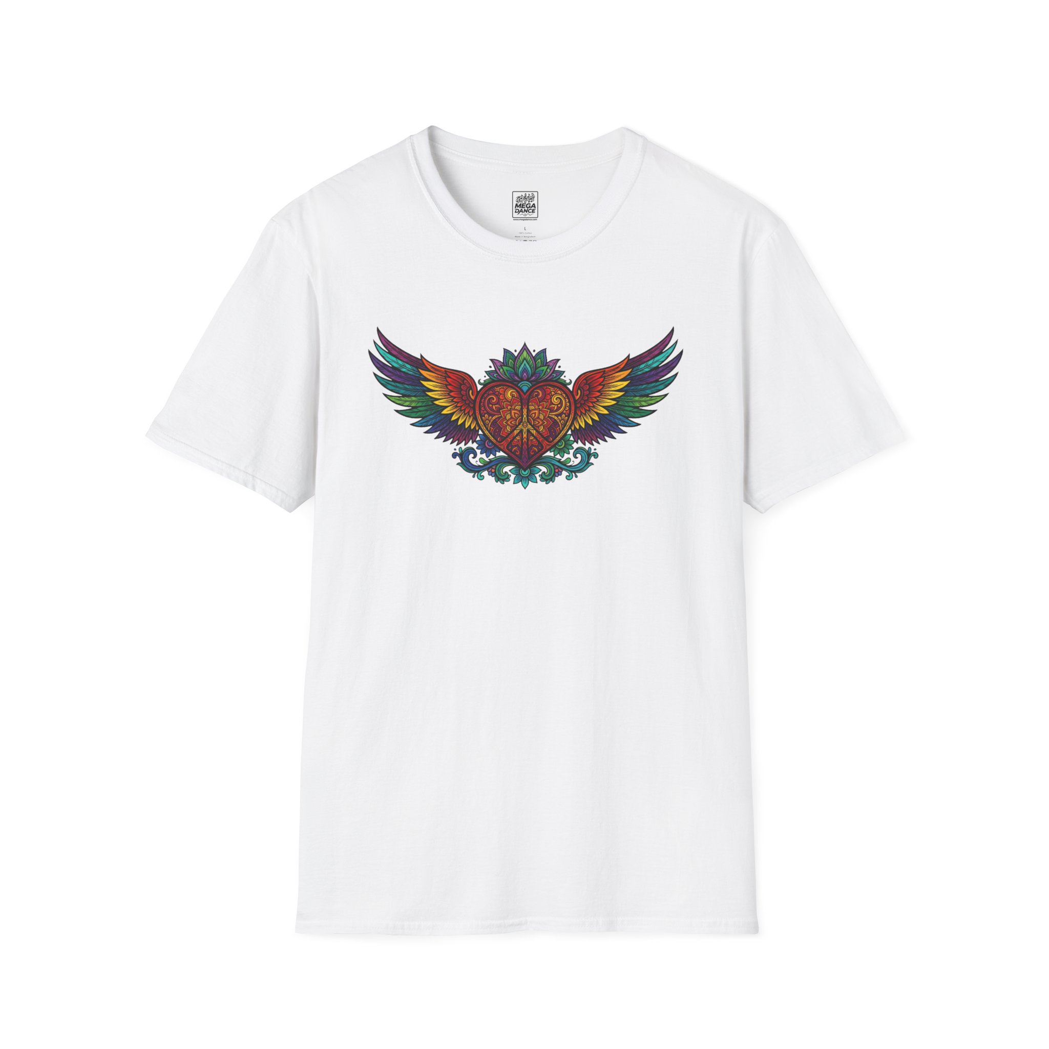 This lightweight crew-neck tee carries a bold, colorful winged-heart emblem that reads like a travel-stamped memory — vivid, slightly vintage, and made to move with you. The design sits centered on a clean white canvas so the artwork pops without shouting. Wear it on walks through music-flecked streets, at laid-back shows, or when you want a simple layer that still tells a story. Breathable ring-spun cotton and a classic cut keep the silhouette easy and familiar; the tear-away label and reinforced shoulder tape make it comfortable enough for repeating wear. It ages gently with washes, letting the print become part of your everyday rhythm.