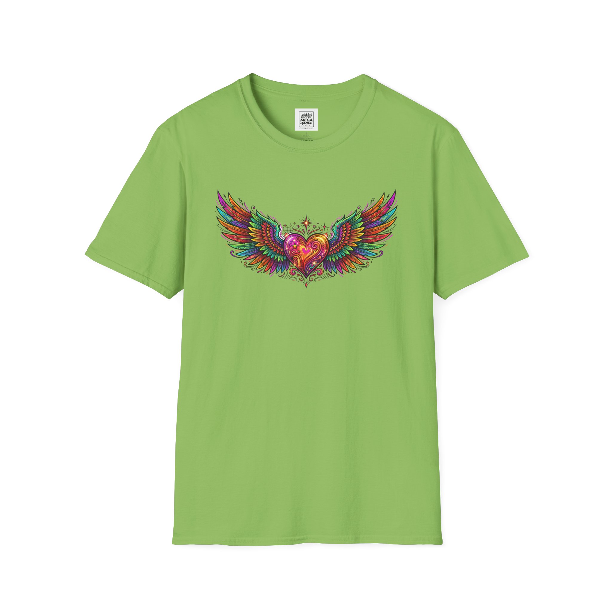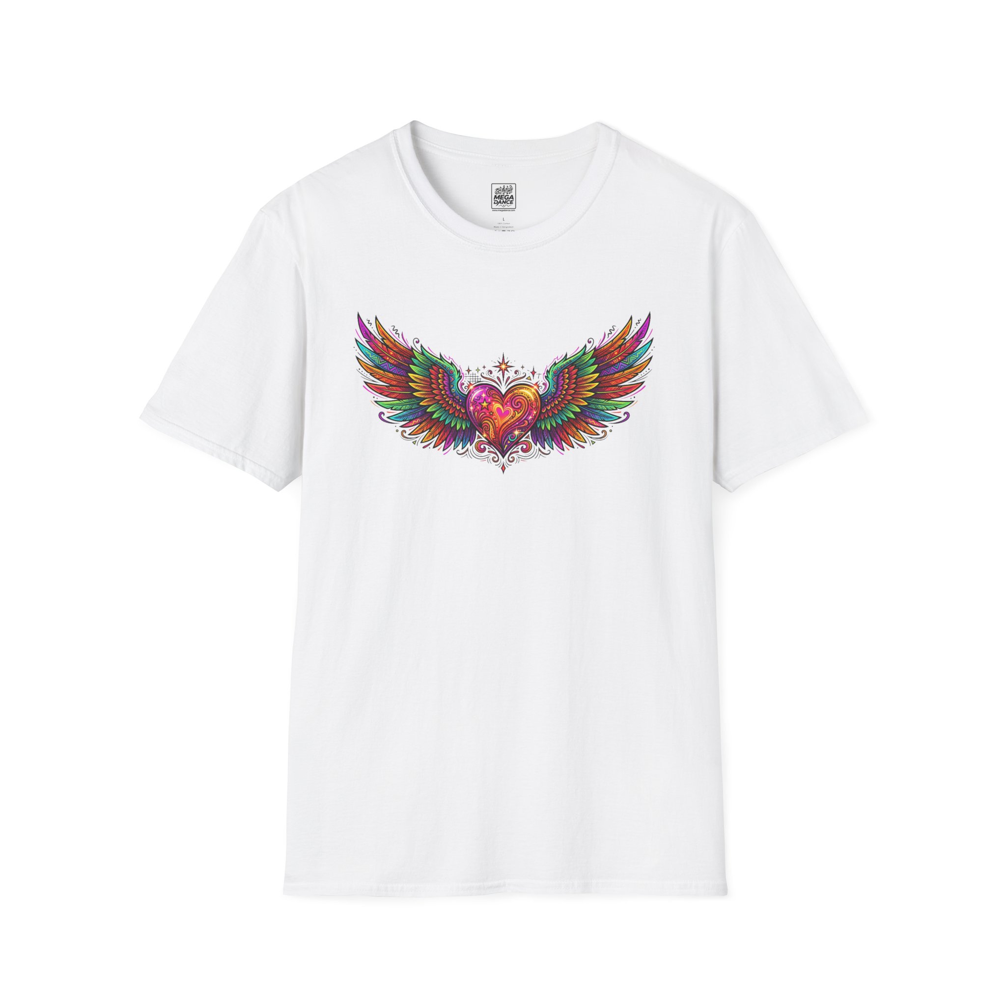 This lightweight crew-neck tee carries a burst of color across the chest: a hand-drawn heart with outstretched, painterly wings and delicate ornamental details. The design reads like a love letter in flight — bold, tender, and a little rebellious. Wear it on slow weekend mornings at the café, under a denim jacket for evening strolls, or layered at an art show to add a bright, personal accent to a simple outfit. It settles comfortably against the skin and lets the artwork do the talking — expressive, wearable, and quietly confident.