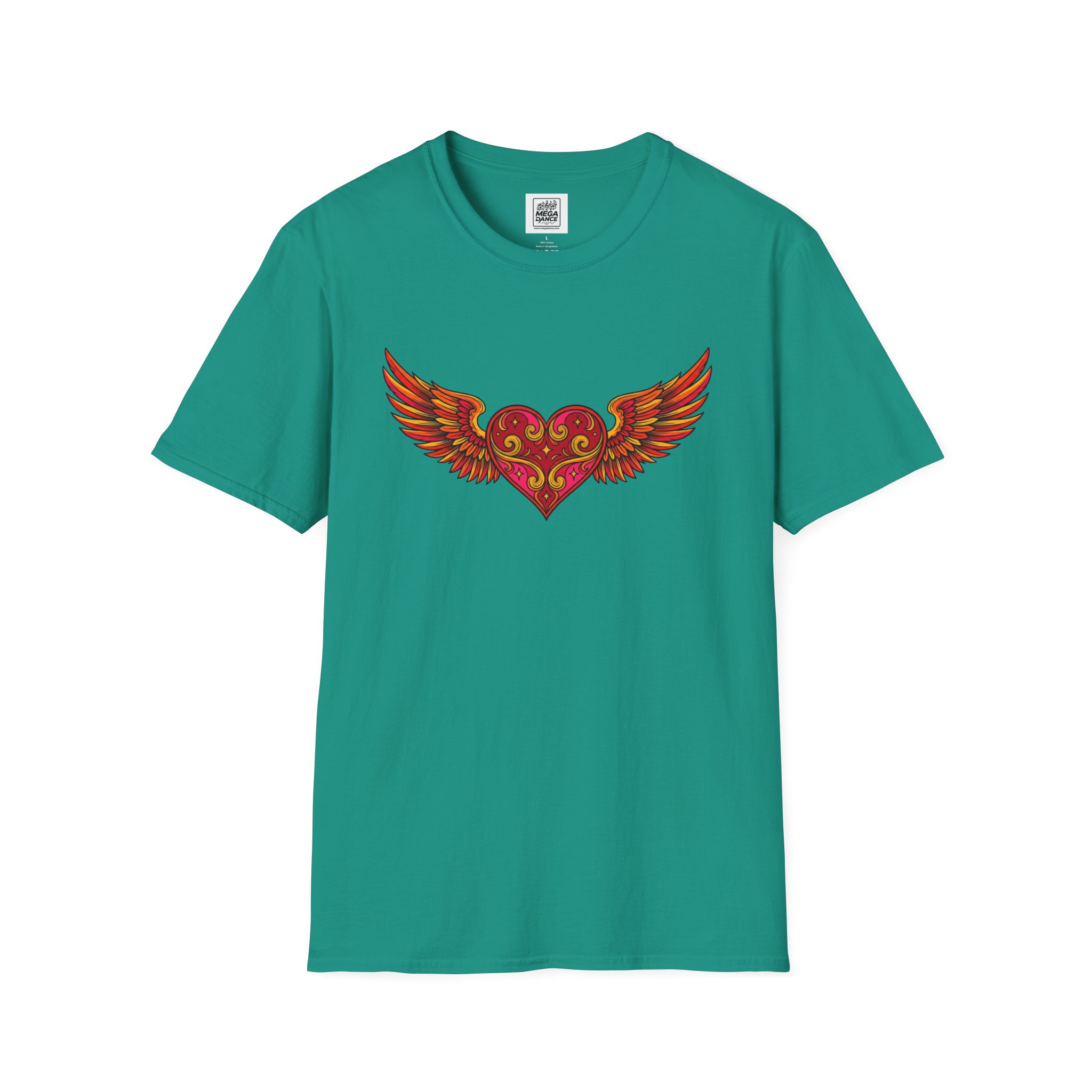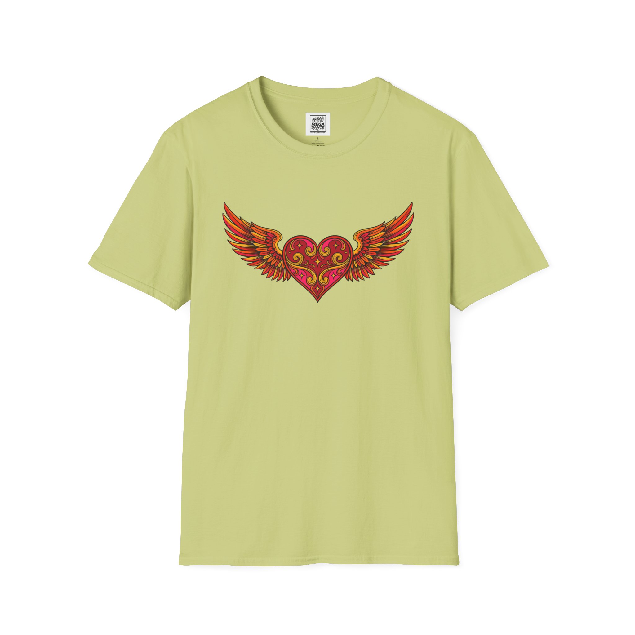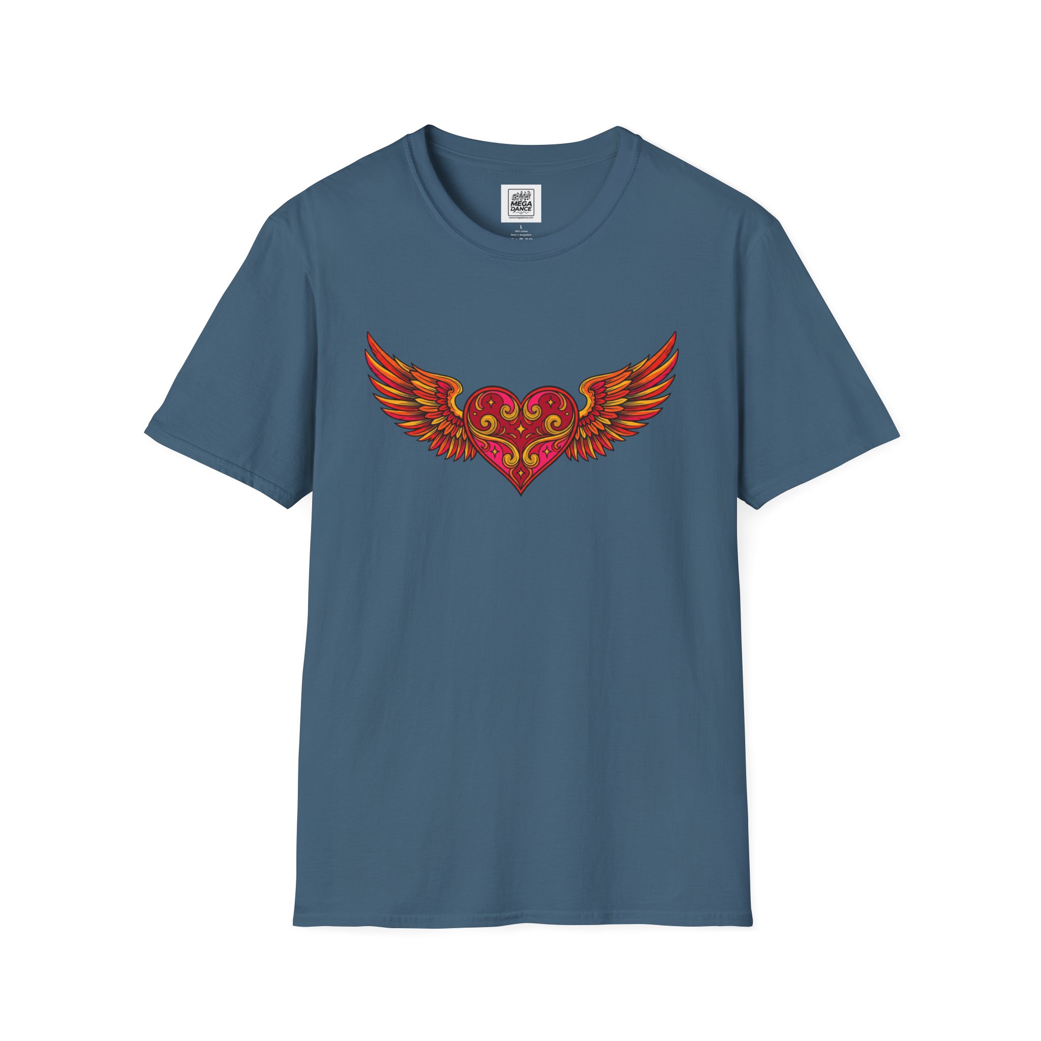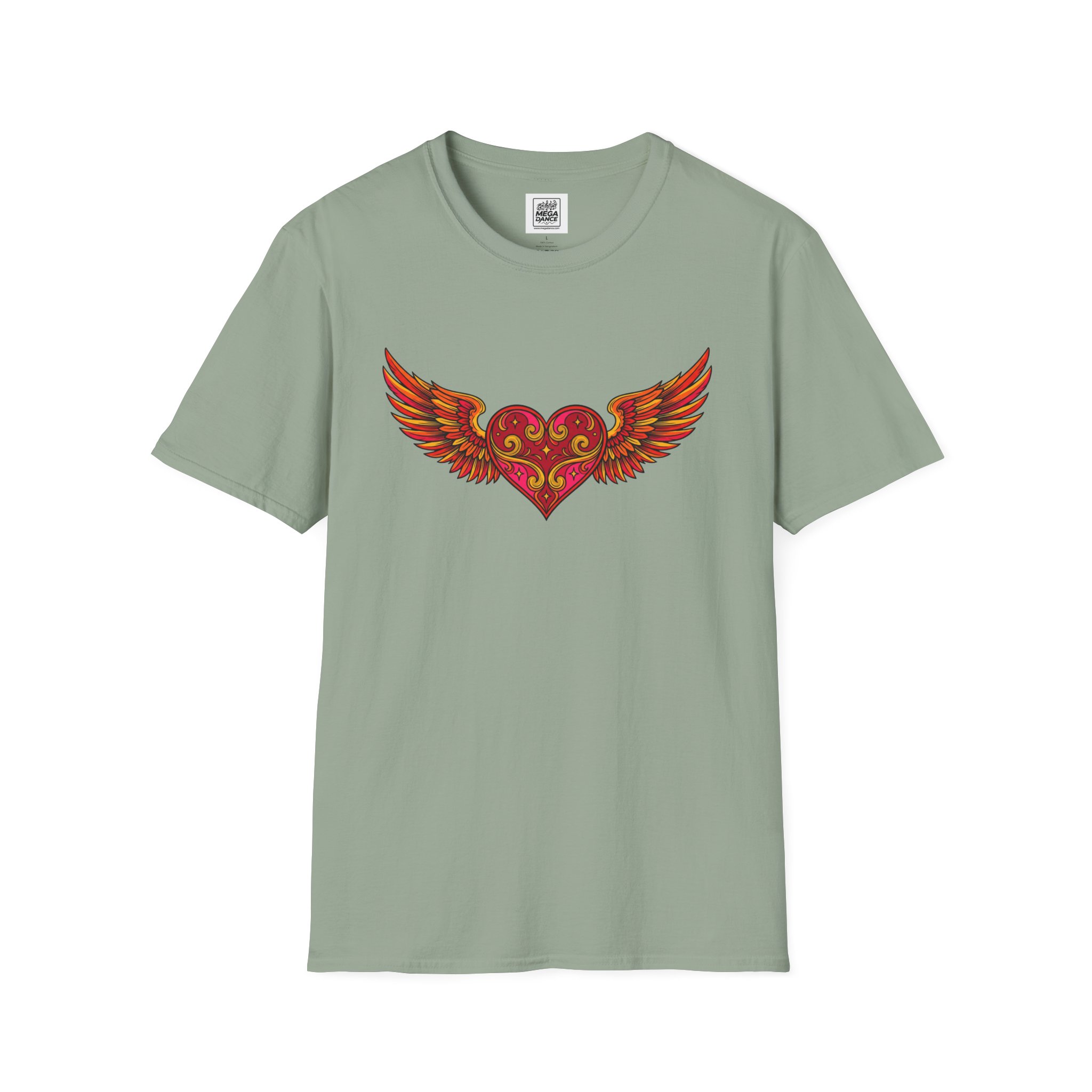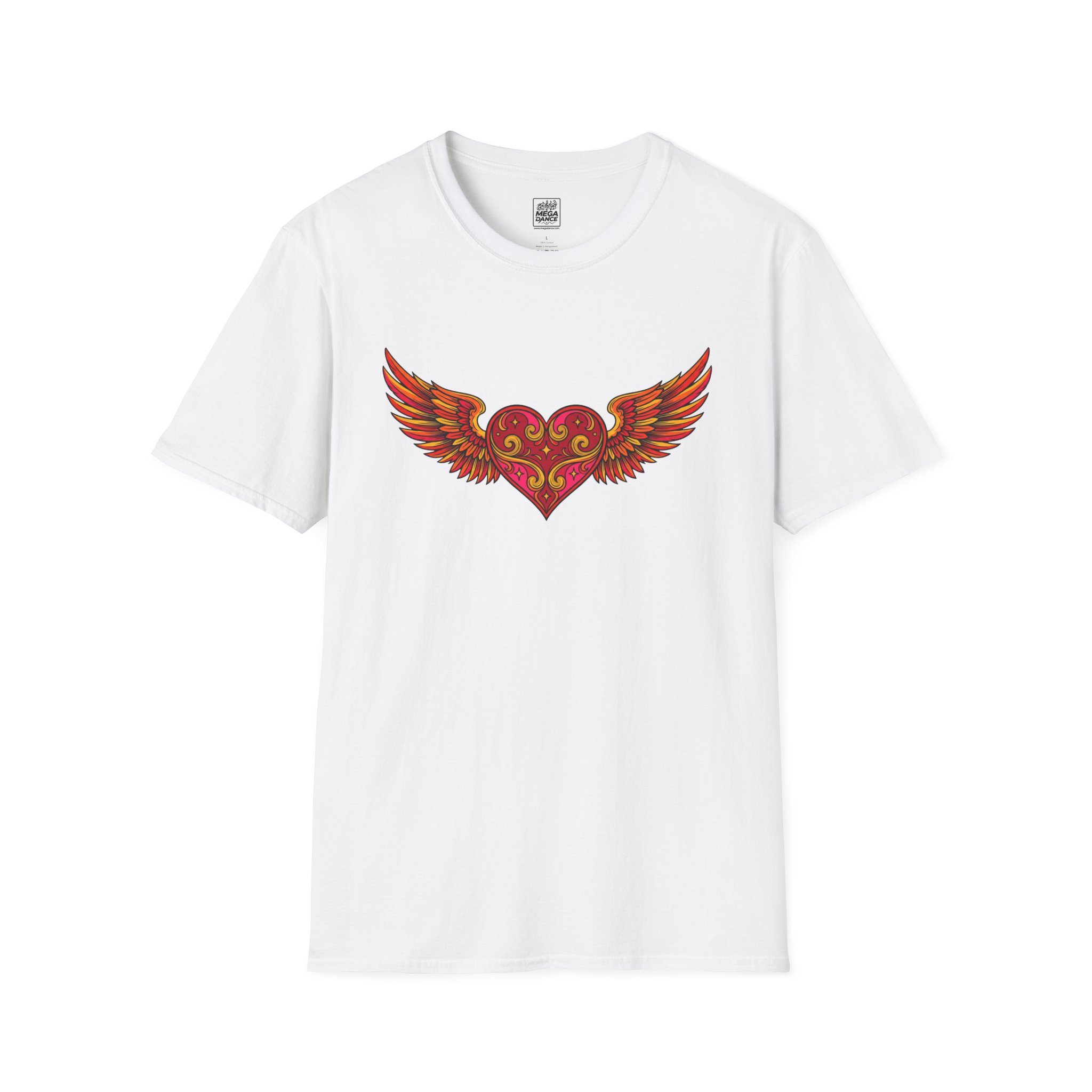 This lightweight cotton tee carries a bold, hand-painted heart with outstretched wings across the chest — a small piece of wearable art that feels both intimate and adventurous. The crewneck sits close to the throat and the classic fit drapes cleanly, making this shirt easy to layer or wear solo on warmer days. The print’s rich reds and golden accents look like they were brushed on by candlelight; they soften with wear and become part of your everyday look.
