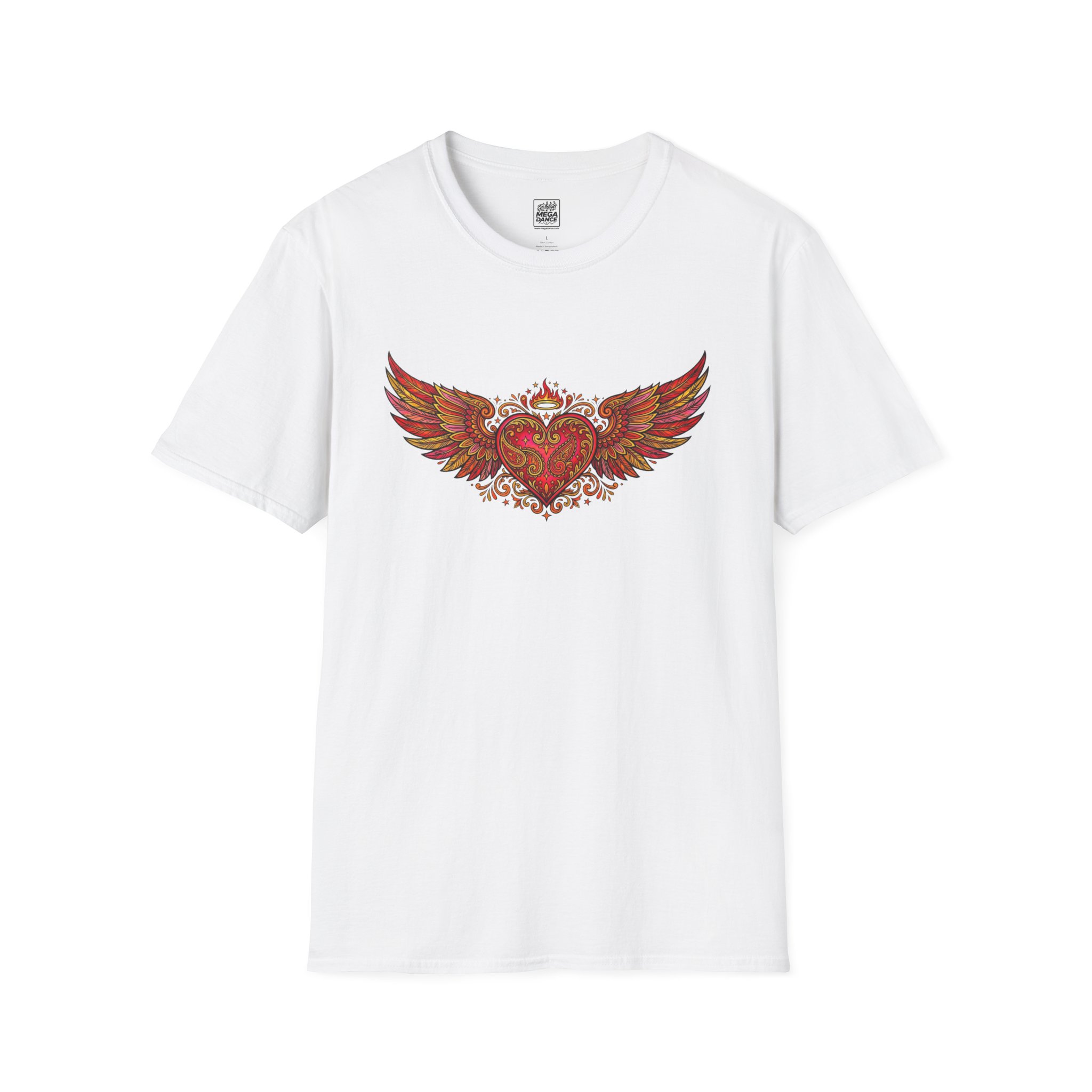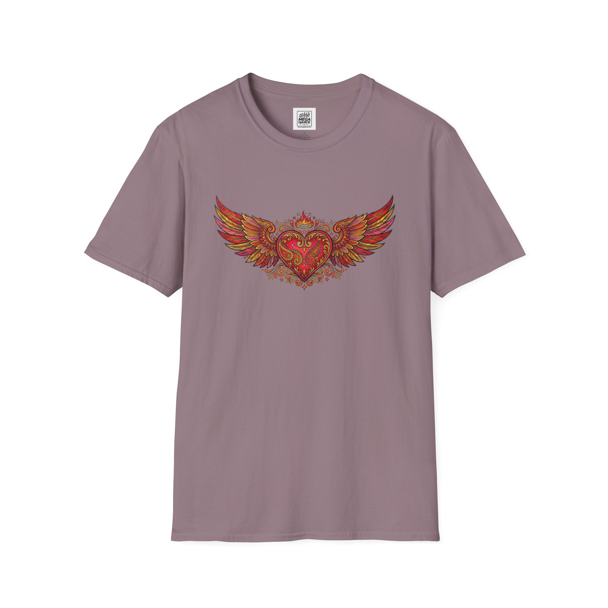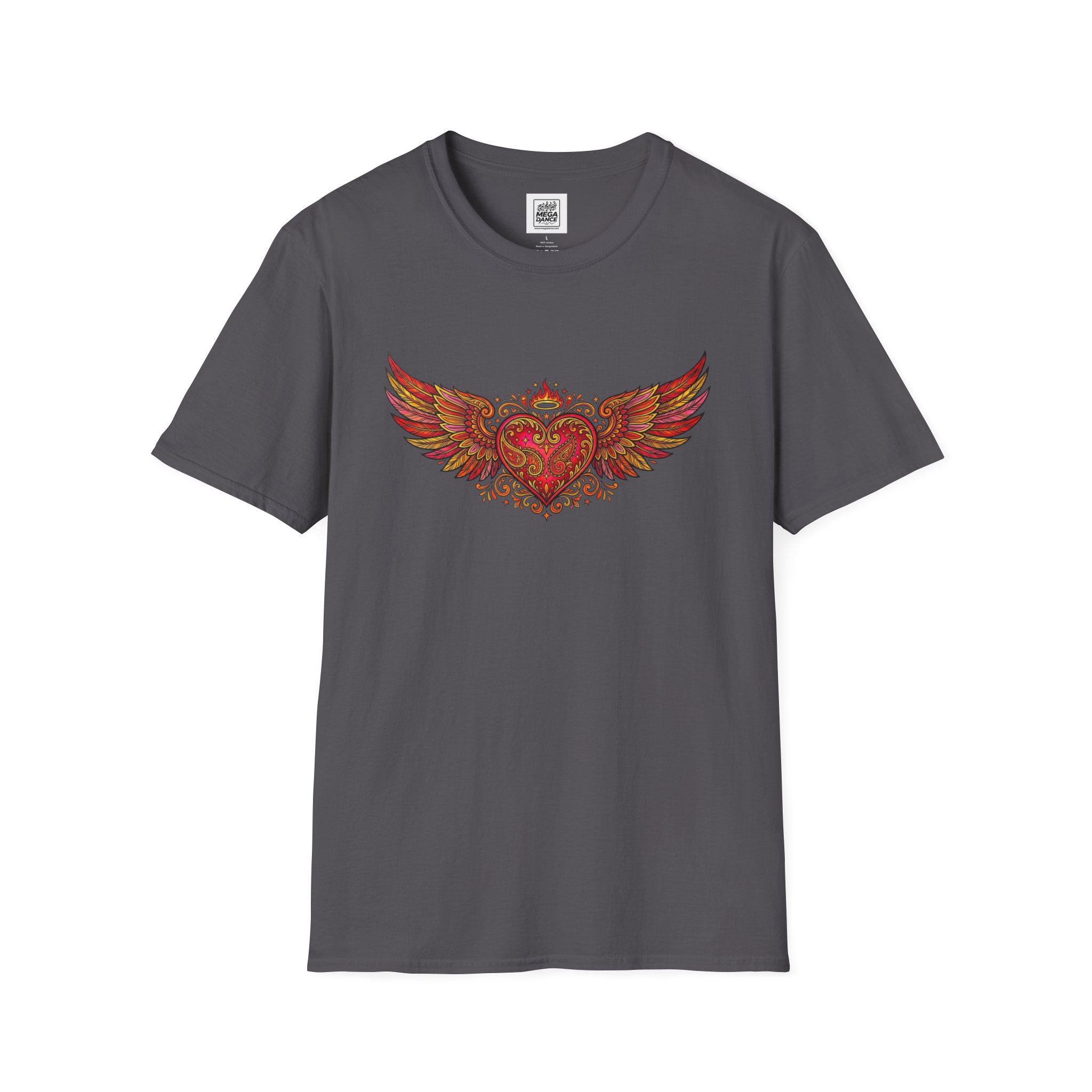 This lightweight crewneck shirt carries a bold, hand-illustrated heart with outstretched wings across the chest — a little bit outlaw, a little bit romantic. The soft ring-spun cotton drapes easily and breathes all day, while the classic fit and clean neckline keep the artwork front-and-center. Wear it on long drives, nights around a fire, or when you want to quietly declare loyalty, love, or reclaimed strength. The tiny natural flecks in the undyed option and the pearlized tear-away label add subtle, lived-in character without distracting from the design. Built to last and made with responsibly grown cotton, it’s the kind of tee you reach for when you want an honest, worn-in look with a graphic that still turns heads.